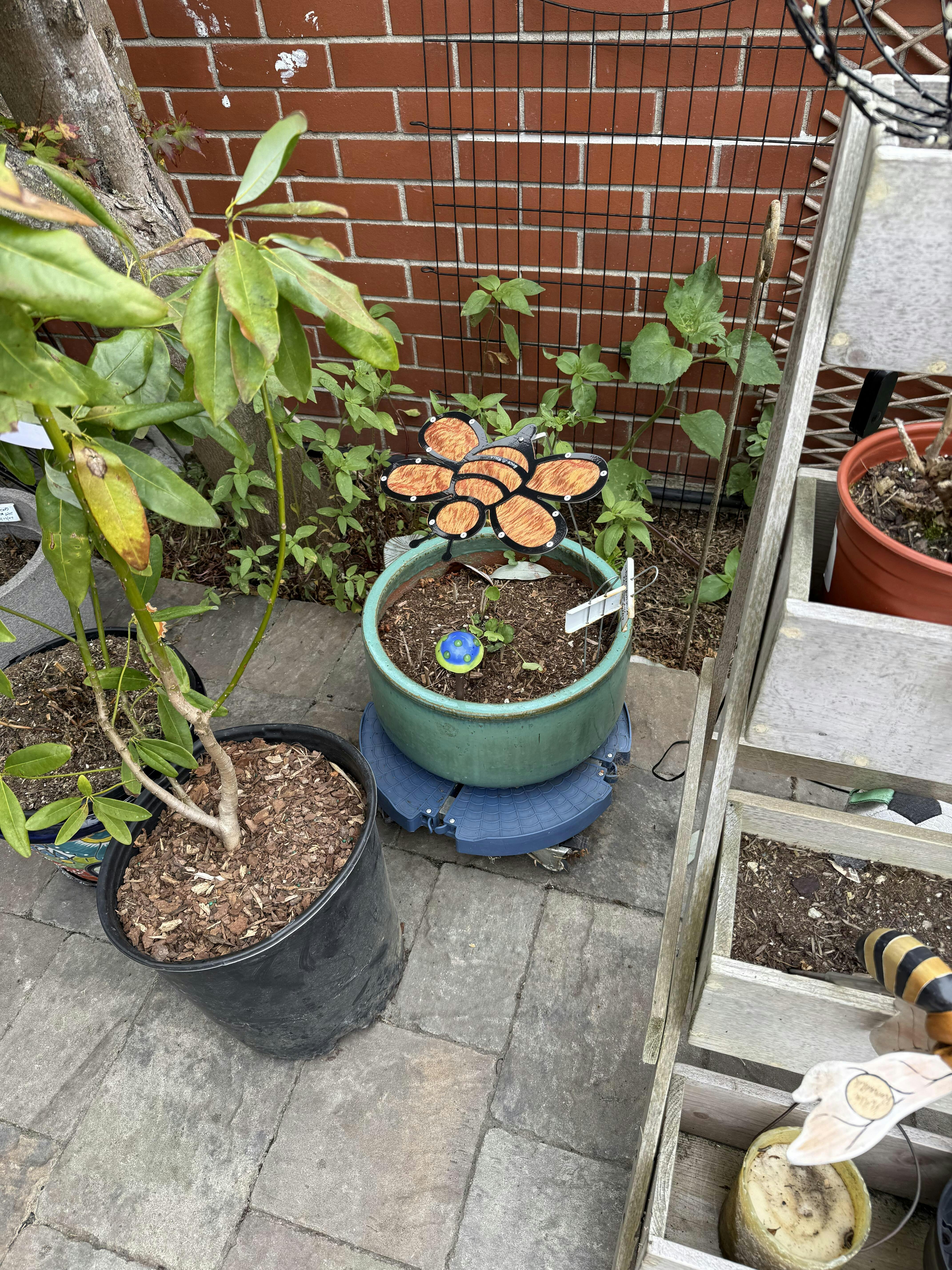 This adorable bee has a black powder coated frame with orange shimmer cloth. Comes with our new 18" tall stainless steel rod and is great for window boxes, patio plants or small garden plants. Meant for small plants under 15" tall but also great for shading the soil and roots of larger plants. Great way to add a pop of color to any garden or yard! This cloth is not an outdoor cloth and the color will fade. We suggest you use uv protective spray every 3 months to help keep your shimmer cloth looking bright. It does fade down to a pretty silver patina. Plant shade, shade umbrella, plant umbrella, shade for plants